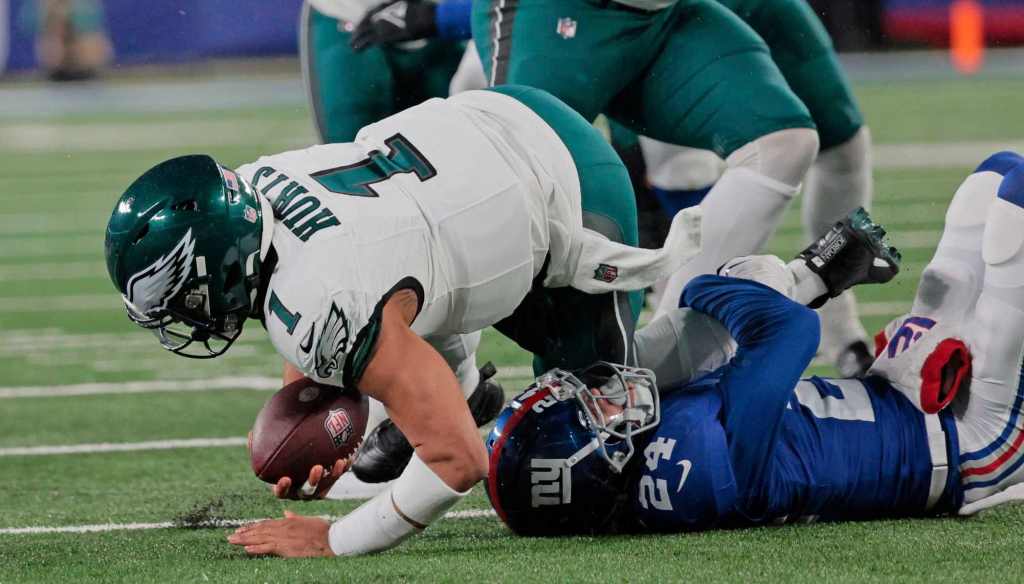 Philadelphia QB Jalen Hurts was 24-of-33 for 283 yards with a touchdown and an interception. He also ran for a touchdown. A.J. Brown caught six passes for 80 yards and Dallas Goedert nine for 110 and a touchdown. Barkley ran for 58 yards on 12 carries.